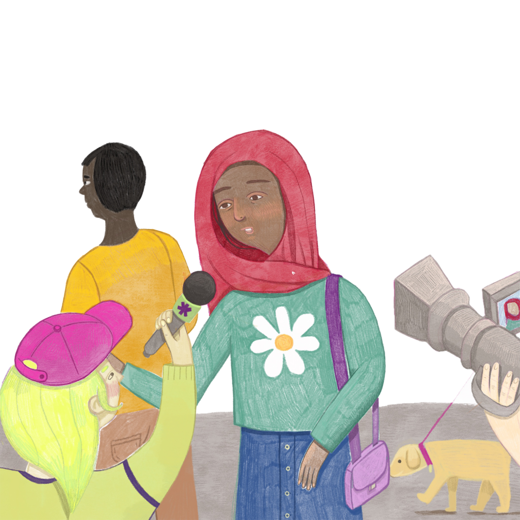 «Possiamo andare lì travestiti da reporter, e fingere di dover scrivere un articolo sul tema della cittadinanza. Chiedere informazioni alle persone che incontriamo, e così saperne un po’ di più» dice Bit. Mega annuisce: il piano sembra funzionare. In un attimo, Bit si trasforma in un adulto umano, con tanto di registratore per le interviste e telecamera, proprio come hanno visto fare ai giornalisti qualche volta sulla tv terrestre. Mega nasconde alla bell’e meglio sotto un cappellino le antenne: sembra una bambina, più che un’adulta terrestre, ma indossa un paio di scarpe con i tacchi alti per sembrare più grande: vestita così e in compagnia di Bit, il trucco dovrebbe funzionare.